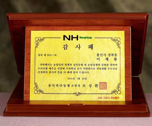 순도 99.9%의 24K골드판에 로고 및 문구를 인쇄하는 최고급 상패입니다. 가리비 형식의 원목 끼움 받침대에 골드인쇄판이 끼워지는 형태로, 가장 격식 있는 시상식에 어울립니다.