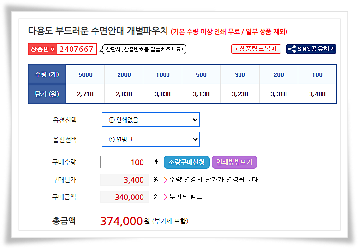 수면안대 제작을 진행하실 때 가장 중요한 건 바로 최소 제작 수량과 단가예요. 저희 양면 수면안대는 최소 30개부터 소량제작이 가능해요. 100개 기준으로 개당 3,400원, 대량 제작 시에는 2,710원으로 단가가 내려가죠.