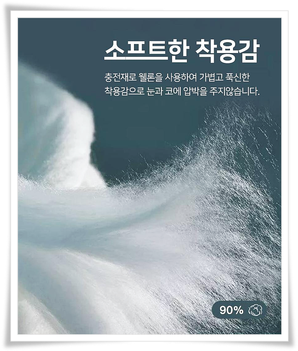 웰론 충전재를 사용해서 무게감이 거의 느껴지지 않으면서도 푹신한 착용감을 제공한다는 점도 빼놓을 수 없어요. 제가 직접 써봤을 때 코나 눈 주변에 압박감이 전혀 없더라고요. 일반 안대들은 착용하고 있으면 답답하거나 불편한 경우가 많은데, 이 제품은 정말 착용하고 있는지 모를 정도로 가벼워요.