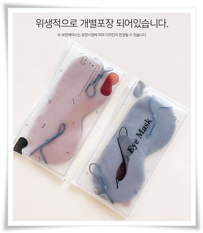 제가 판촉물 제작에서 가장 중요하게 생각하는 부분 중 하나가 바로 위생이에요. 특히 얼굴에 직접 닿는 제품이라면 더더욱 그렇죠. 이 양면 수면안대는 위생적인 개별 파우치 포장이 무료로 제공돼요.